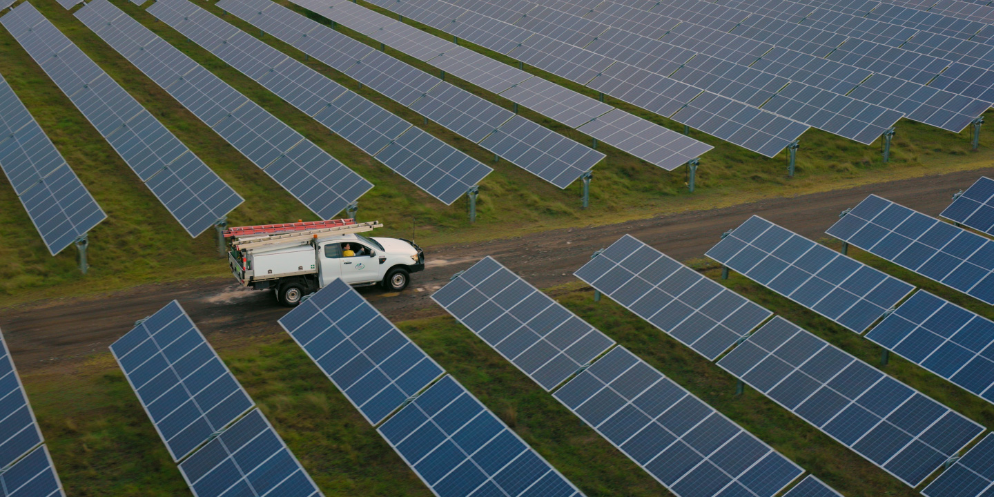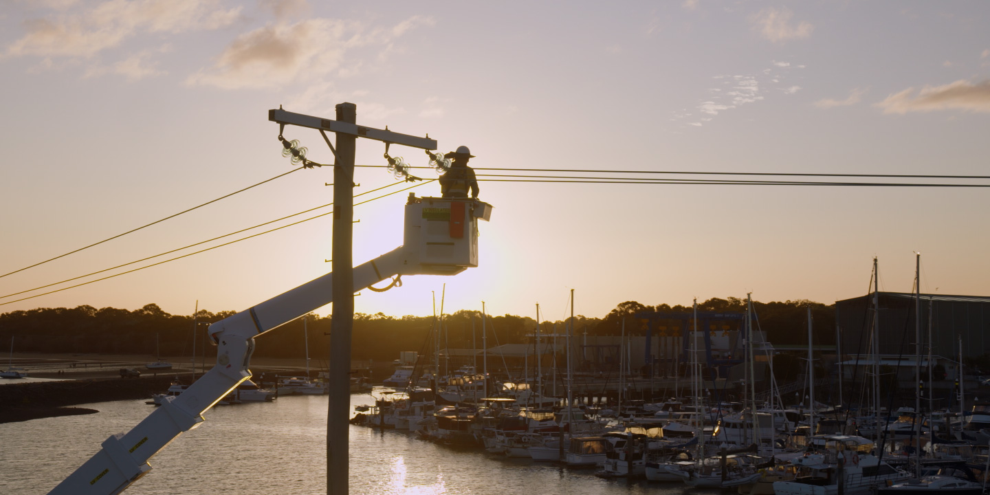 A field worker dressed in safety gear holds an iPhone while talking with a crew member