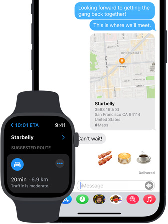 盡享各款 Apple 裝置給你一路順暢無阻的體驗。Apple Watch 提供觸感反應,以發出一下輕點提示你往正確的方向前進,讓你在步行時無需拿出 iPhone;Mac 上的日曆提示功能會在夠鐘出發時,提醒你停下手上工作並起行;HomePod 只需你吩咐一聲,便會在你準備外出時幫忙找路線,然後傳送至你的 iPhone。而地圖 app 會與 Siri、Spotlight、訊息及天氣 app 自動同步,適時給你相關資訊。