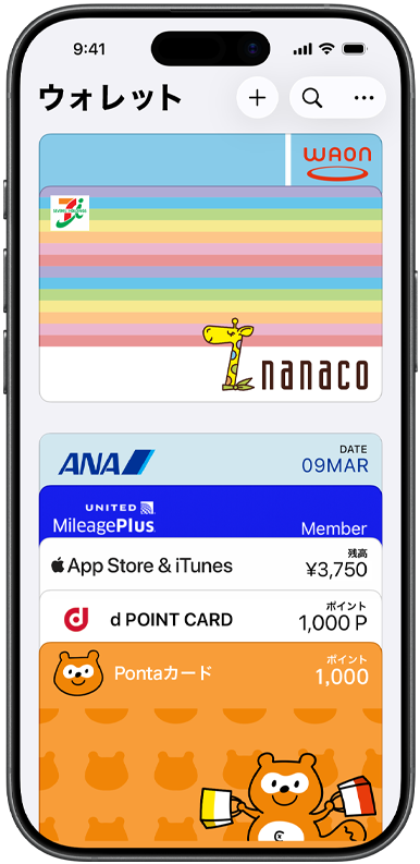 設定は一瞬。Apple Payの設定は簡単です。クレジットカードなどをiPhone上のウォレットアプリに追加するだけで、すぐに使えます。Suica、PASMO、ICOCAを加えれば、iPhoneまたはApple Watchをかざすだけで、自動改札をスムーズに通ることもできます。カードのポイントは引き継がれ、特典もこれまでと同じように利用できるので安心。がんばって貯めたポイントやマイルを失うことはありません。