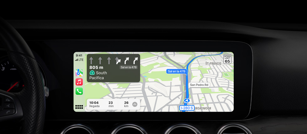 CarPlay lleva el poder y la sencillez de Mapas al volante. Puede hacerte sugerencias inteligentes basándose en datos que almacenas en tu dispositivo, como direcciones que aparecen en tus emails, mensajes de texto, contactos y calendarios. Y gracias al gran nivel de detalle de los mapas, las indicaciones de voz paso a paso y las experiencias inmersivas en 3D, ahora es más fácil que nunca llegar a tu destino.