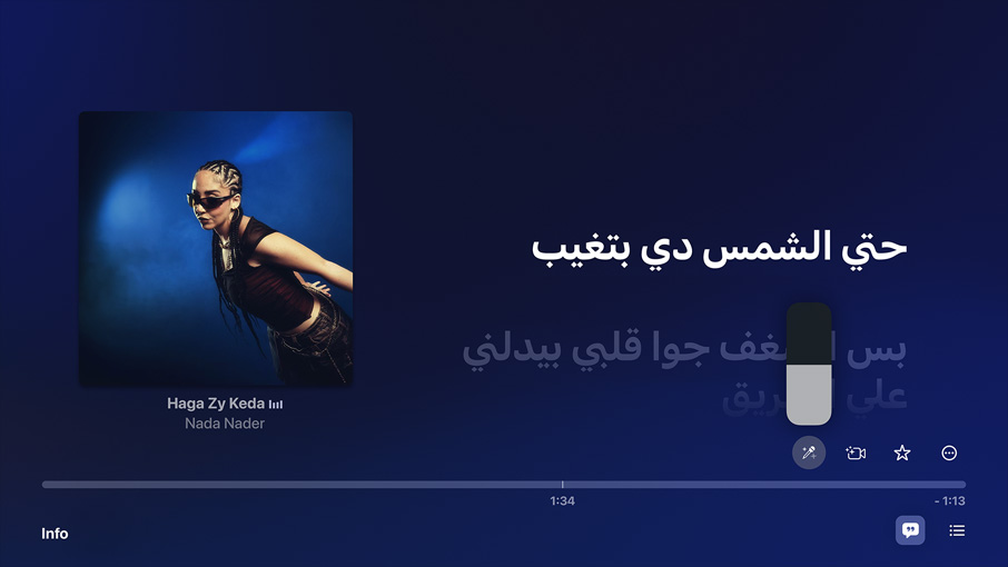 استمع إلى أكثر من 100 مليون أغنية و30,000 قائمة تشغيل ومحطات الراديو المباشر على الشاشة الكبيرة. وبفضل ميزة "غنِّ مع Apple Music" ستصبح نجم العرض،6 إذ يمكنك غناء أجمل الأغنيات مع عرض الكلمات في الوقت الفعلي. وبفضل الأصوات القابلة للتعديل، يمكنك إطلاق العنان للفنان الذي في داخلك لتغني منفرداً أو مع الفنان، أو تنضم إلى الجوقة في الخلفية.4