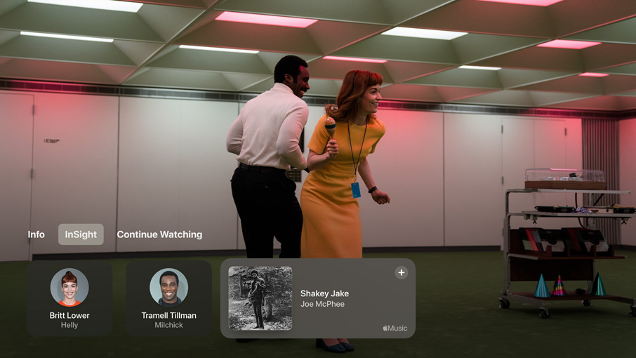 ميزة "لمحة". احصل على معلومات عن مسلسلات وأفلام Apple Originals الأصلية من +Apple TV أثناء مشاهدتها. ما عليك سوى عرض أدوات التحكم في تشغيل الوسائط لمعرفة المزيد عن الممثلين الذين يظهرون على الشاشة والموسيقى التي يتم تشغيلها. ويتم تحديث التفاصيل تلقائياً مع تغير المشهد. وعندما تستخدم iPhone كريموت لجهاز Apple TV، تظهر المعلومات مع ميزة "لمحة" بين راحة يديك.5