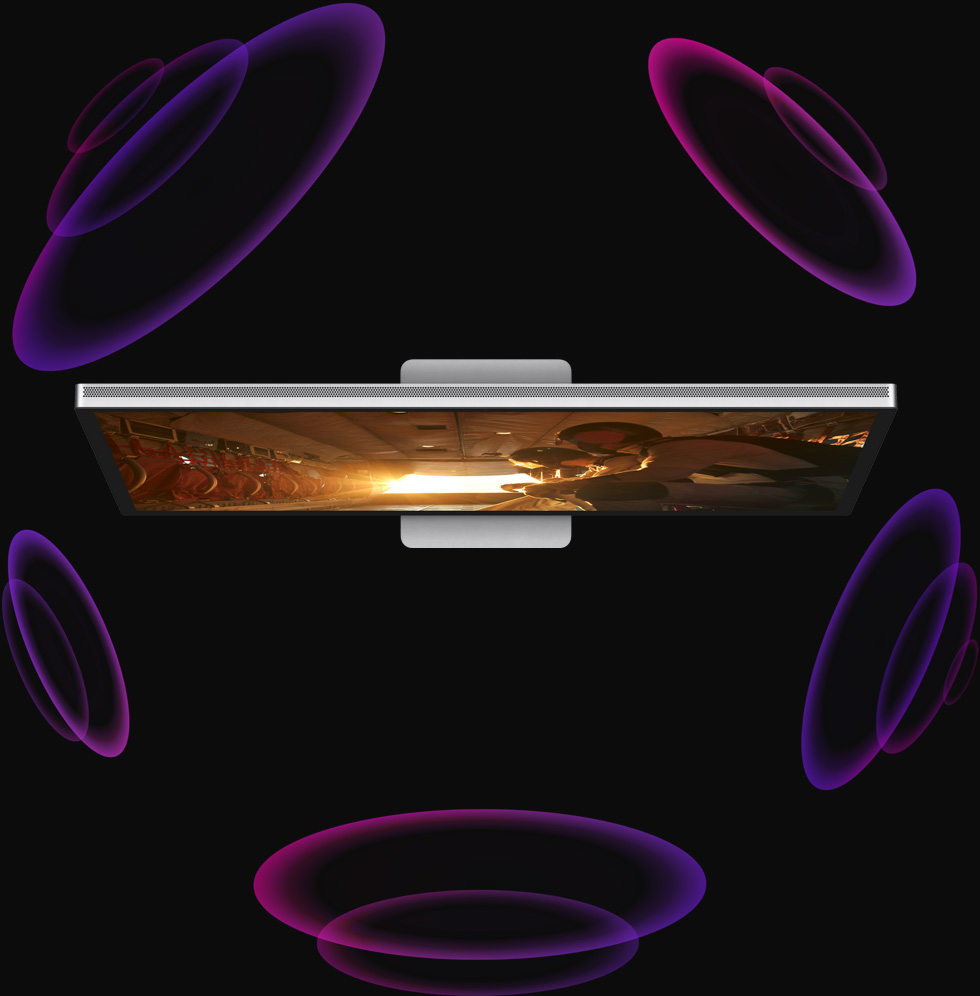 أربعة مكبرات صوت ووفر مضادة للاهتزاز تنتج صوت باس قوياً وواضحاً وتقلّل التشويش. بينما ينشئ اثنان من المجاهير عالية الأداء طبقات متوسطة دقيقة وأخرى عالية نقية. باختصار، إنه نظام مكبرات الصوت الأعلى جودة على الإطلاق لجهاز Mac.